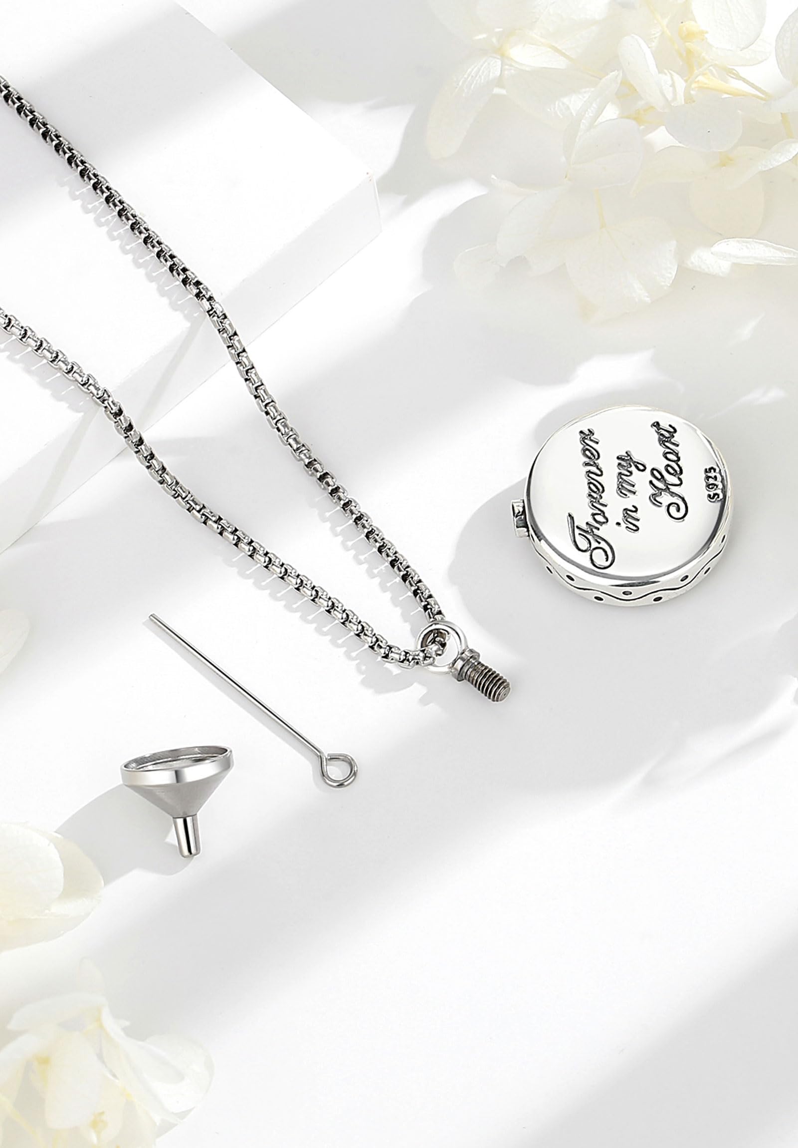 - YOU WILL RECEIVE : 1 * Sterling Silver urn necklace for ashes, 1 * 20inch 316 stainless steel chain, 1 * Exquisite packing box, 1* Funnel tool.